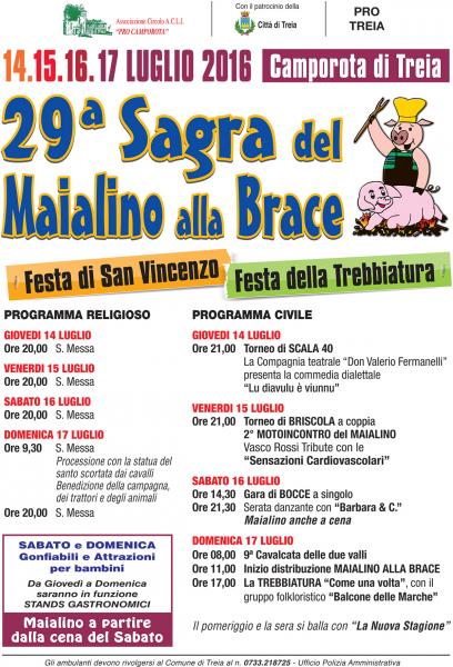 Siamo giunti ormai alla 29a edizione della sagra del Maialino alla Brace che si svolgerà dal 14 al 17 luglio a Camporota di treia. Come ogni anno il programma è ricco di spettacoli e iniziative. Si inizia giovedì sera con l'immancabile appuntamento con la compagnia teatrale “Don Valerio fermanelli” che ci farà divertire con una brillante commedia dialettale dal titolo “Lu Diavulu è viunnu” di Giuseppe Medori. Durante la serata si svolgerà anche il torneo di Scala 40. Proseguiamo venerdì con il torneo di briscola, ma la vera attrattiva della serata sara il 2° motoincontro del Maialino durante il quale si esibiranno i “Sensazioni Cardiovascolari” tribute band di Vasco Rossi. Il sabato entriamo nel pieno dell'evento, dove potremo gustare Il Maialino alla Brace, durante il pomeriggio si svolgerà la gara di bocce a singolo poi le sera suonerà per noi la band Barbara e C. Concludiamo domenica 17 con una giornata ricca, si inizia presto la mattina con la 9a cavalcata delle due valli, a pranzo saranno aperti gli stand gastronomici e nel pomeriggio il gruppo folkloristico “Il balcone delle Marche” ci riporterà indietro nel tempo con la rievocazione della Trebbiatura. La sera poi sarà la band “La Nuova Stagione” a farci ballare fino a tarda notte. Il sabato e la domenica saranno presenti giochi gonfiabili e attrazioni per bambini oltre alla ricca ruota. L a grande novità di quest'anno è la 1° lotteria del maialino che si concluderà domenica sera con l'estrazione dei numeri vincenti. Ampia disponibilità di posti al coperto. Quindi vi aspettiamo tutti a Campaorota!!!