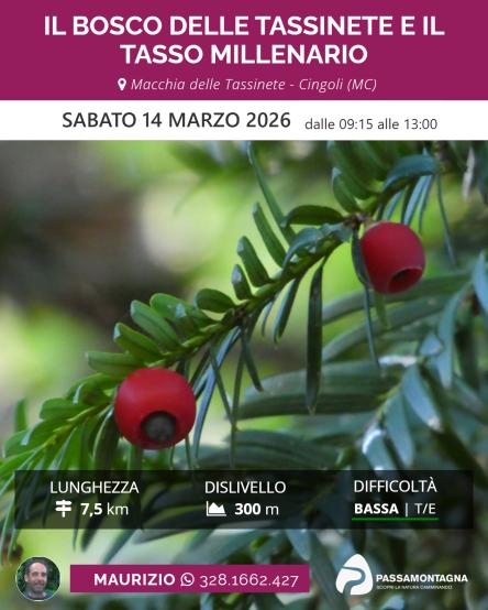 Una semplice e piacevole escursione ad anello immersi nel bosco delle Tassinete, un'area forestale di grande importanza per la presenza del Tasso (Taxus baccata), una conifera oramai molto rara a causa della deforestazione. Passeggeremo sempre avvolti nella magica atmosfera del risveglio del bosco invernale, tra querce, aceri, carpini, faggi e le prime colorate fioriture. Sulla via del ritorno,godremo di una vista inusuale su Cingoli  e ammireremo, alla fine dell'escursione un maestoso esemplare millenario di Tasso di 5 m di circonferenza, recentemente scoperto.