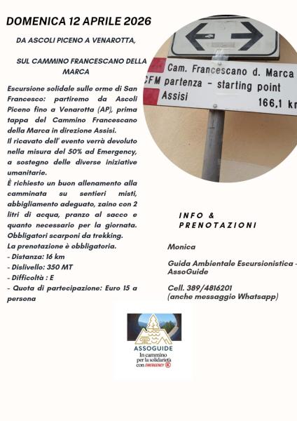 Escursione solidale per Emergency, sulle orme di san Francesco: percorreremo la prima tappa del Cammino Francescano della Marca (in direzione Assisi) che da Ascoli Piceno ci condurrà a Venarotta, località simbolo del passaggio del santo nell’anno 1215.
