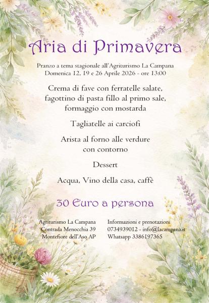 Prenotazioni e informazioni: tel. 0734939012; WhatsApp 3386197365; info@lacampana.it